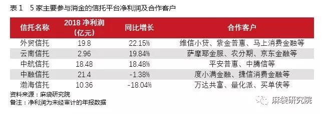 根据信托业协会数据,目前已经有二十多家信托公司参与到消费金融业务中,其中外贸信托、云南信托、中航信托等消费金融的业务已过亿。麻袋研究院选取其中5家信托,展示其主要合作客户及上一年度净利润情况: