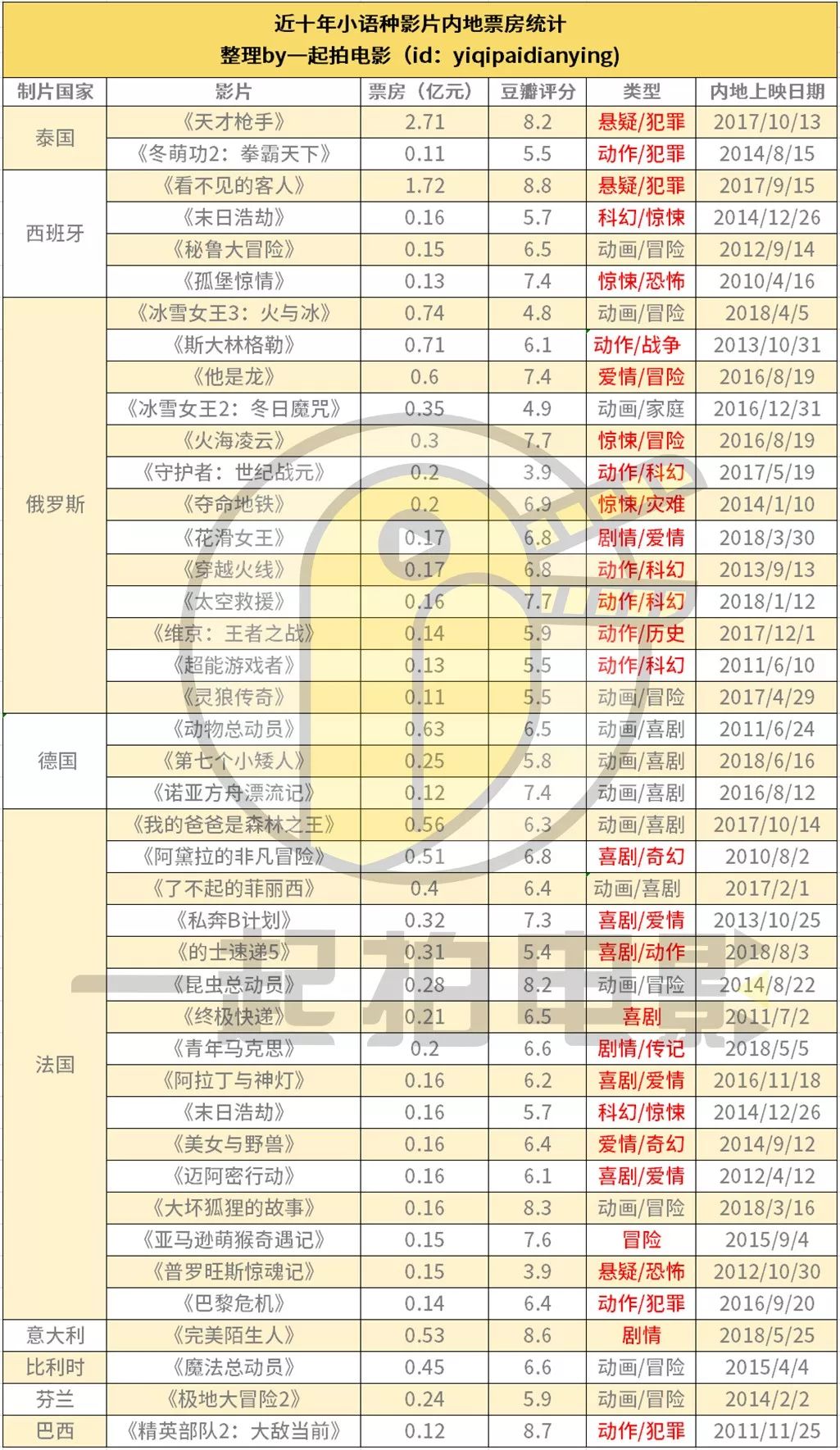 为了更好的了解小语种影片的票房表现,拍sir对近十年的小语种影片进行了票房梳理。像日本、印度这样的由于内地市场每年都有很多影片上映,这样的批片引进大国不做讨论,本文也只讨论引进不多的批片国家。