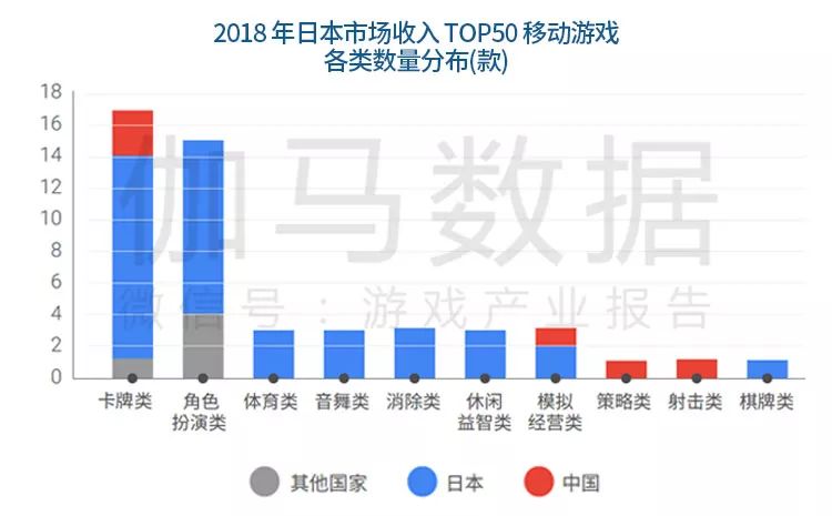日本市场收入TOP50中,日本游戏产品占据绝大多数。相对而言,中国游戏在卡牌类、模拟经营、策略类和射击类占有一定份额。未来,还需在日本用户喜爱的游戏类型上发力,如卡牌类和角色扮演类。