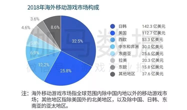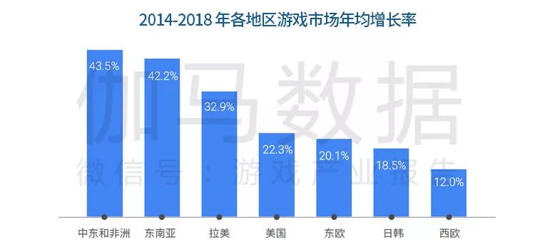 日韩、美国和西欧是海外移动游戏收入的重点市场。中东和非洲及东南亚,目前虽然整体市场规模较小,但其增长率均超过40%,有望成为未来全球移动游戏的重点市场。