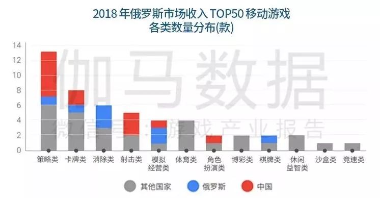 在俄罗斯市场收入TOP50移动游戏中,外来产品占比达到84%,中国移动游戏占比较高,在俄罗斯市场有较大需求的类型中,如策略类、卡牌类、射击类以及模拟经营类等方面,中国移动游戏均有上榜。未来,中国移动游戏还需要在消除类、体育类等方面进一步发展。