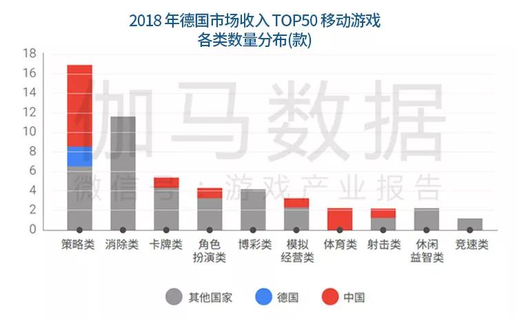 目前,德国市场收入TOP50中,海外游戏占据绝大多数。中国游戏在德国多个类型游戏中均有上榜,尤其在策略类游戏中表现突出。