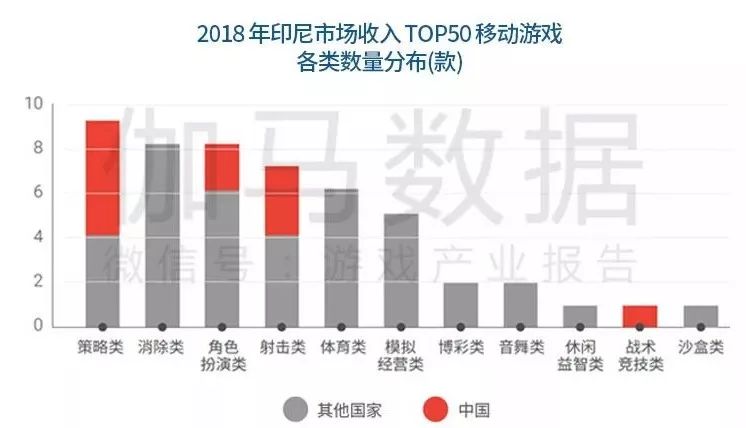 印尼游戏市场收入TOP50中,策略类、消除类、角色扮演类、射击类等多个游戏类型市场表现较好。其中,中国移动游戏产品在策略类、角色扮演类以及射击类中已经有所涉足,未来需要在消除类、体育类、模拟经营类等游戏产品方面进一步发展。