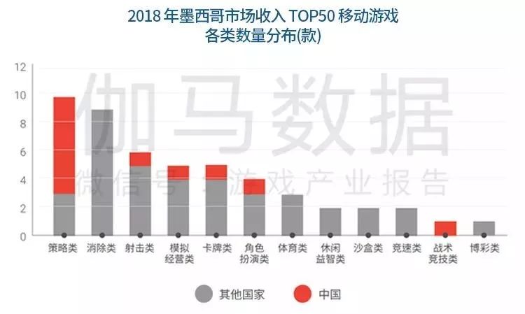 在墨西哥市场,收入TOP50移动游戏全部由外来产品构成。其中,中国移动游戏在策略类中优势明显。除此之外,墨西哥市场对于消除类、射击类、模拟经营、卡牌类等游戏有着较大的需求,重点推进这类产品的布局,有助于中国移动游戏产品在墨西哥市场的进一步发展。