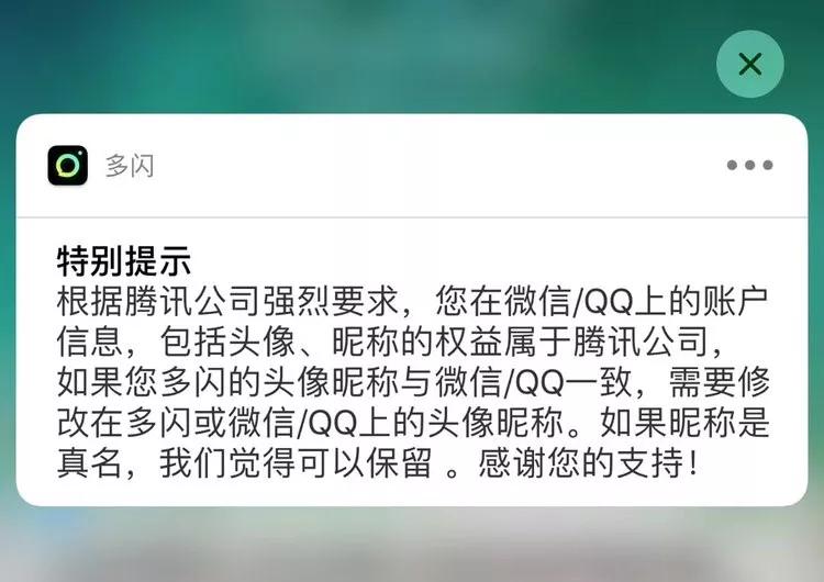 在3月19日下午,字节跳动旗下社交产品多闪app给予用户弹唱提示:根据腾讯公司强烈要求,您在微信/QQ上的账户信息,包括头像、昵称的权益属于腾讯公司,如果您多闪app的头像昵称与微信/QQ一致,需要修改在多闪app或微信/QQ上的头像昵称。如果昵称是真名,我们觉得可以保留。