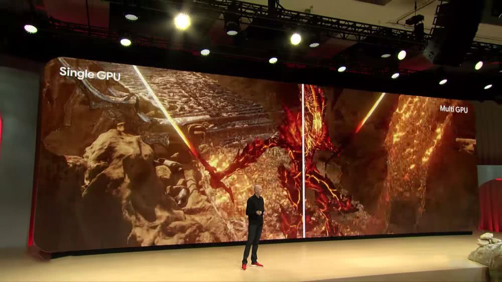 多GPU支持?这是Stadia的部分特性。在GDC 2019的主题演讲中,哈里森展示了以更高的帧速率渲染相同的场景,并使用了更高级的渲染和物理效果