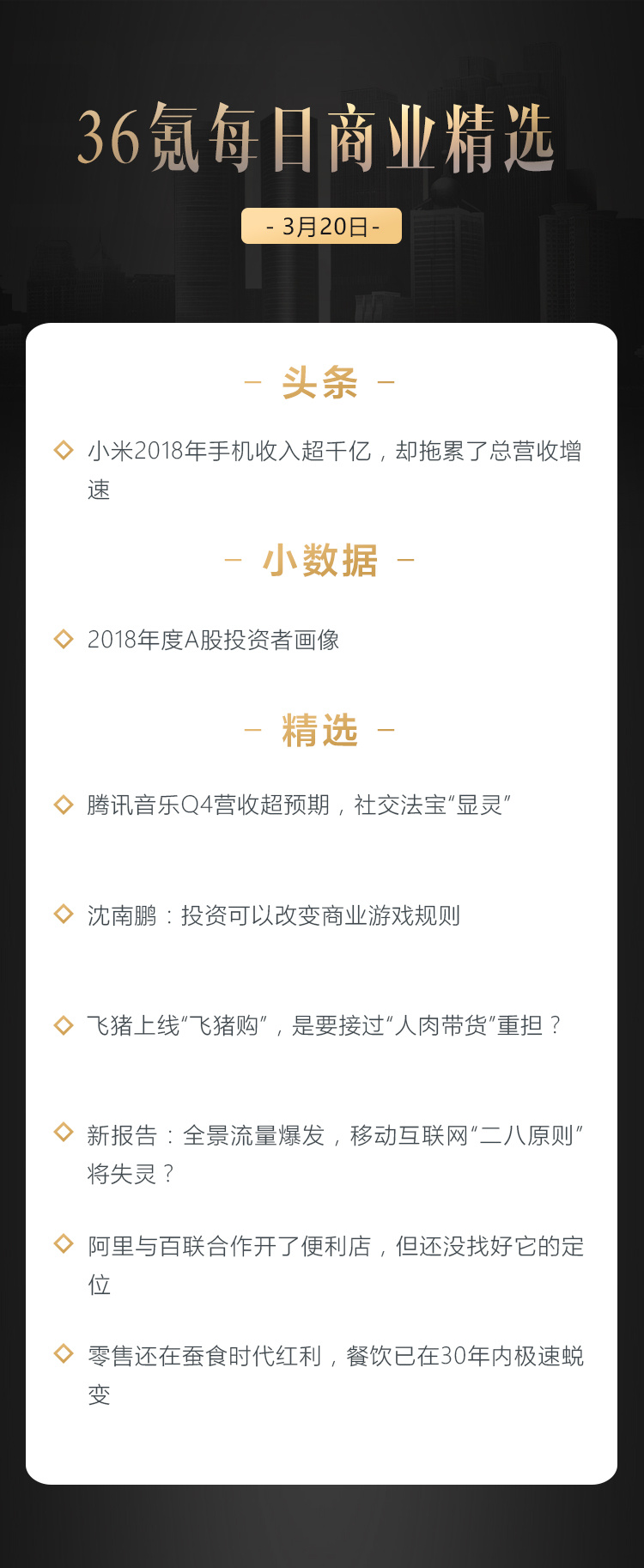 本文来自36氪付费栏目《36氪每日商业精选》——3月20日