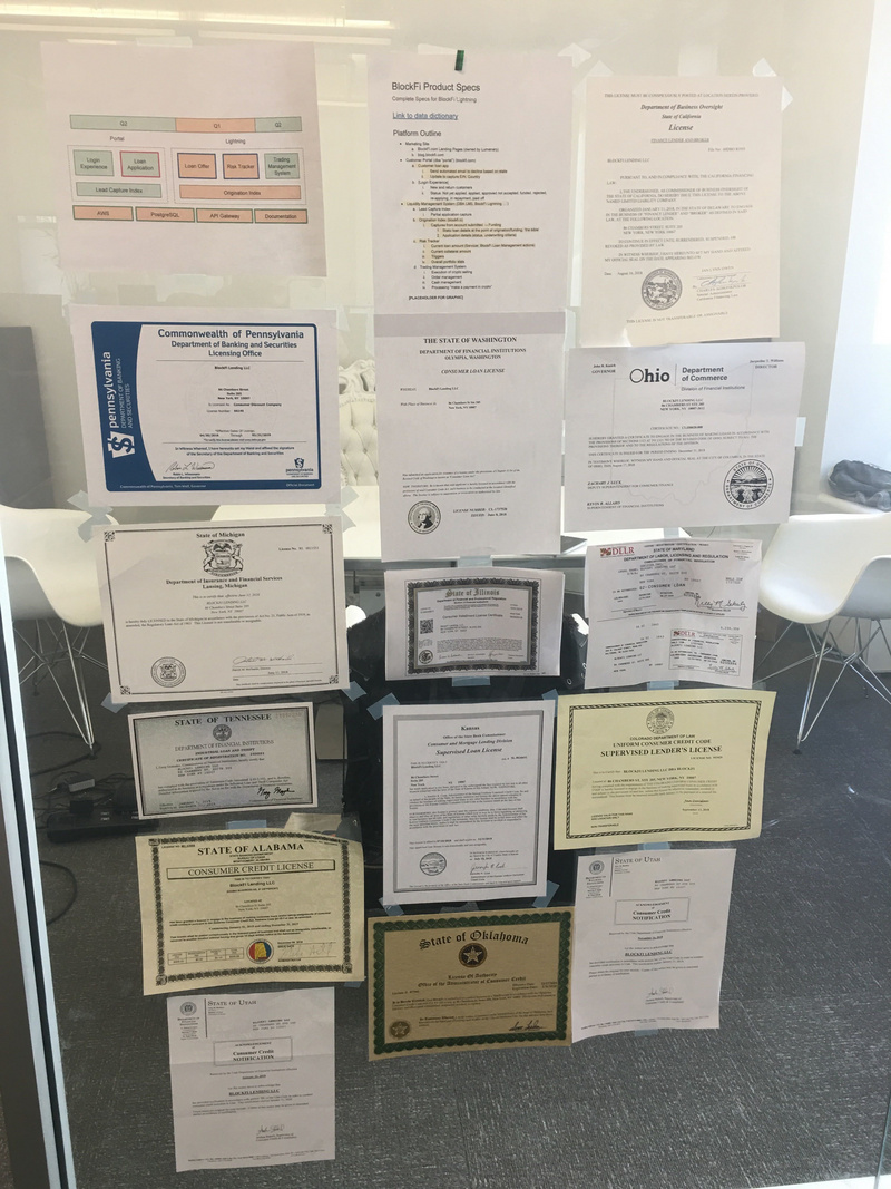 BlockFi 的一些州贷款许可证在其办公室展出