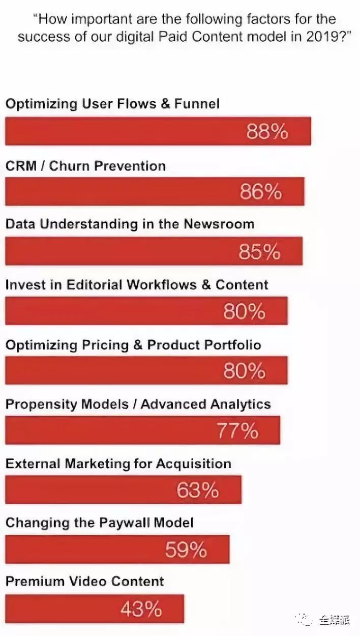 调查涵盖的媒体包括卫报(The Guardian)、费加罗报(Le Figaro)、华尔街日报(The Wall Street Journal)、华盛顿邮报(The Washington Post)和纽约时报(The New York Times)等多家顶级媒体。调查报告显示,去年,预防用户流失被媒体视为影响来年工作成败的第四重要因素,今年该因素攀升至第二。