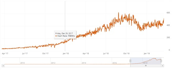 上面这张图,是从2017年4月至2019年3月近两年时间的比特币哈希率走势图。从中你发现了什么?没错,如今的比特币哈希率——即保护整个网络的计算能力(算力),已经达到了自 2018 年 11 月初以来的最高水平。