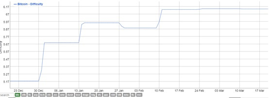 另一方面,如上图所示,比特币挖矿难度在过去的一个月时间里一直保持的相对平稳,这意味着矿工会更容易把矿机部署在网络上挖矿,也会因此吸引更多新矿工入场,这样的结果就是刺激哈希率上升。