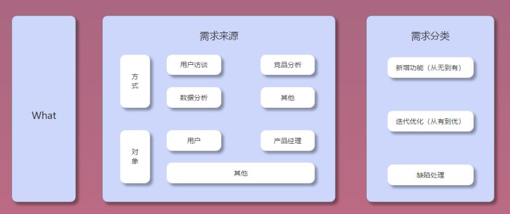 what 层主要让我们标记需求的来源和分类,需求的来源又分为两个维度:方式 & 对象。方式维度:用户访谈,竞品分析,数据分析等产品经理通过某种行为而获得的需求。对象维度:用户,产品经理,其他,对象维度指的是需求的提出对象。