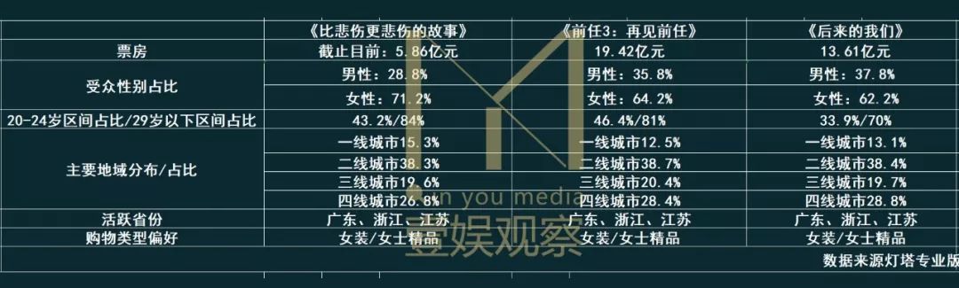 壹娱观察整理了近年引起社会广泛热议并且收获高额票房的三部“哭片”《比悲伤》《前任3》《后来的我们》的受众人群基本资料做分析。