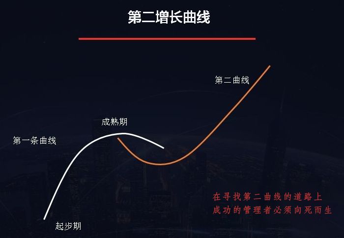 一切事物的发展都逃不开S型曲线,这是“第一曲线”——有高峰就有低谷,如果想持续上升,就不能够总是停留在“第一曲线”的世界。