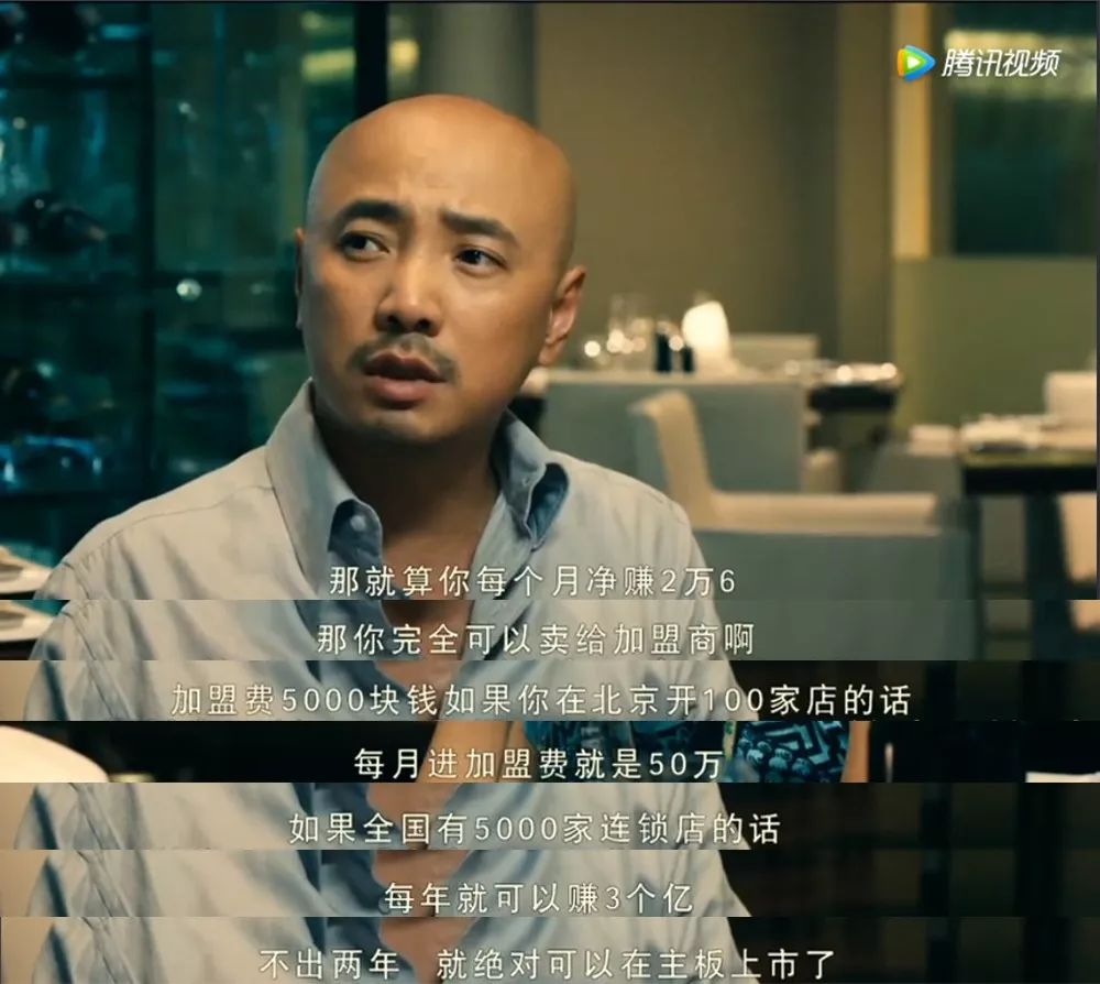 徐峥说:“那你完全可以卖给加盟商啊,加盟费5000,在北京开100家店,每个月加盟费就是50万,一年就是600万,如果全国有5000家加盟店,每年就可以赚3个亿,不出两年就可以上市了呀!你把配方卖给我吧!”