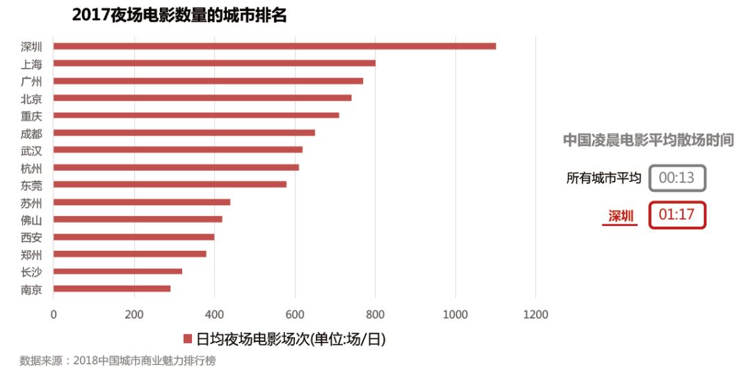 深圳凌晨的平均散场时间最晚:在2017年夜场电影总场次数大于30000场的城市中,深圳平均散场时间最晚,为01:17。