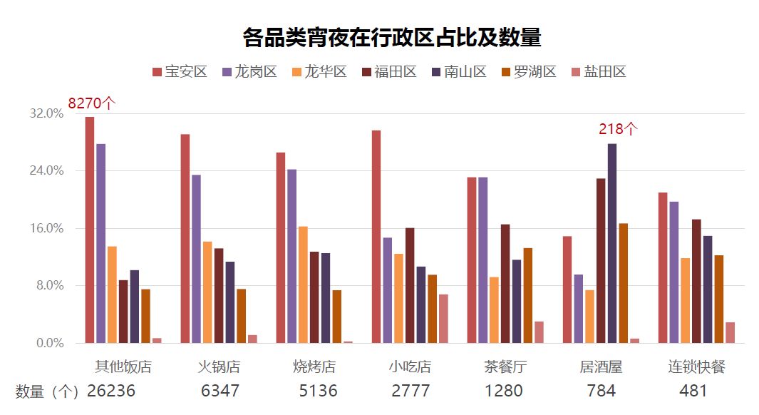 人口大区宝安,龙岗的传统宵夜数量最多,而居酒屋这类新型宵夜则聚集在福田,南山。