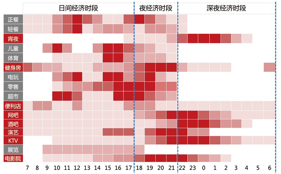 “夜”和“深夜”的界线为22点,绝大多数商铺的打烊时间都集中在22点,22点前后的城市商业环境会呈现较大的差异。