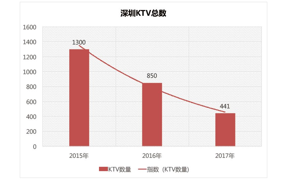 2015年5月,深圳共有约1300家KTV,2017年仅剩441家KTV,仅相当于2015年的34%,KTV整体规模出现明显缩小。