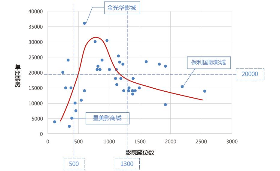 影院规模与营收能力非正相关,从单位营收来看,500-1300个座位的中等规模影院收益更优。