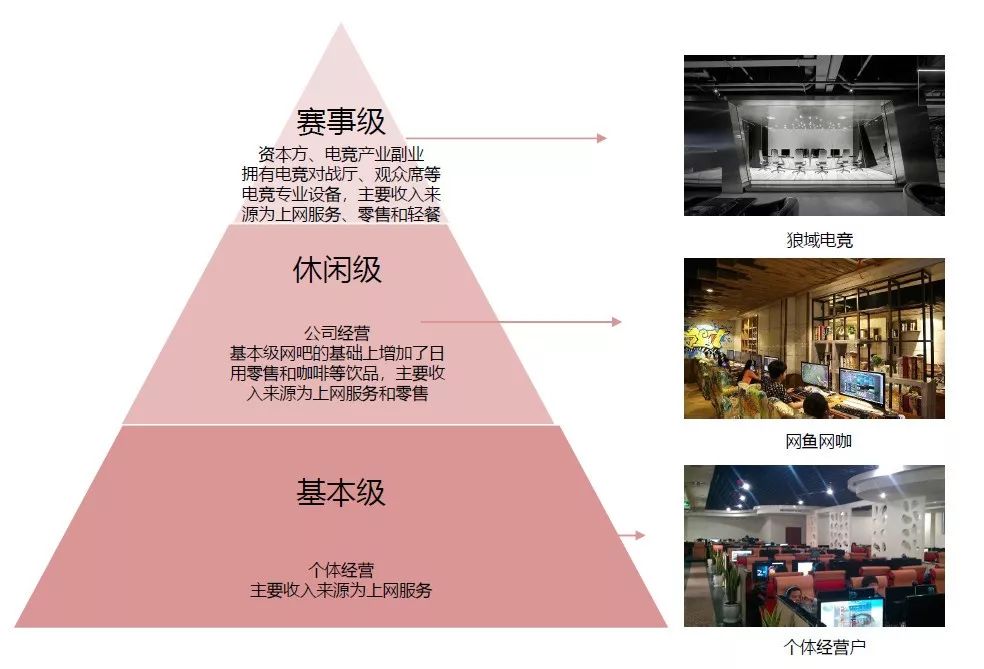 赛事级网吧位于金字塔尖端,因此数量较少;传统网吧占绝对多数