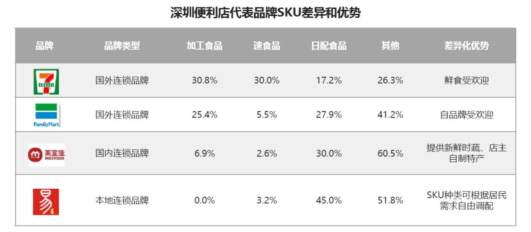 国内连锁便利店品牌偏重社区服务,因此sku日常化的日配食品和杂货比例较高,店主可根据市场反馈灵活调配品类。