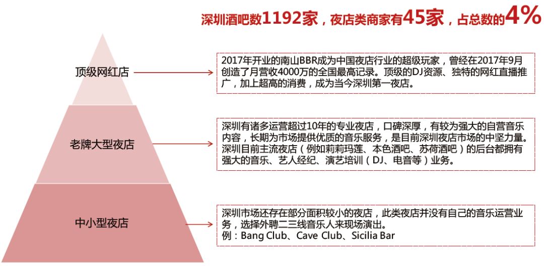深圳夜店目前已形成“高中低”三梯度格局,根据资源整合能力的强弱和消费水平的高低形成典型的金字塔分布。
