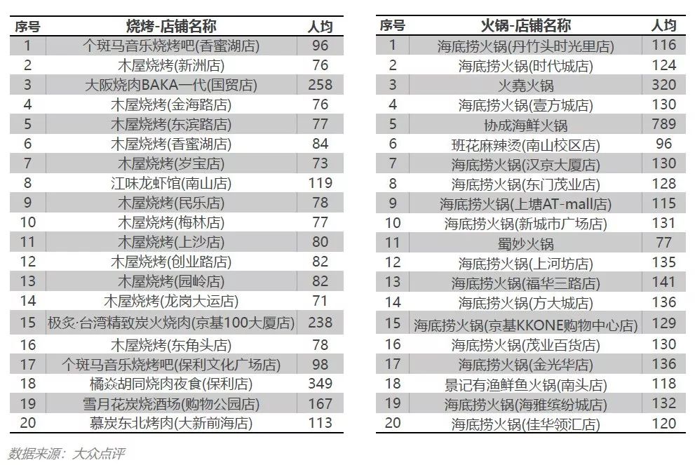 深圳烧烤TOP20中有12家木屋烧烤,2家个斑马,其余6家烧烤也是连锁品牌