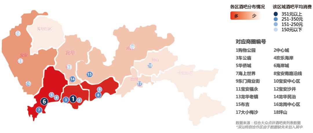 酒吧消费力最强区域为罗湖、福田、南山,与酒吧分布核心区高度一致。