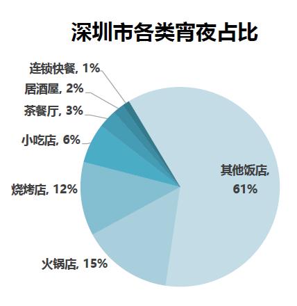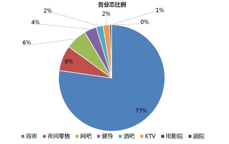 深圳夜生活各类业态商家总数之间存在较大差异,其中宵夜数量占据夜生活商家数量的绝对多数,比例达77%。