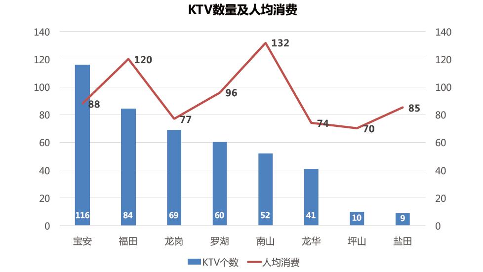 南山区为深圳产业龙头,聚集了深圳最具消费实力的客群,住宅小区高档,因此南山区的KTV人均消费水平整体较高。