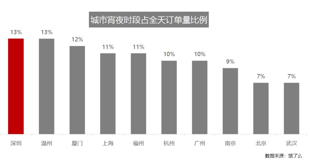 统计城市夜间21点-凌晨2点的外卖订单占比,深圳名列“夜宵之城”榜首 。