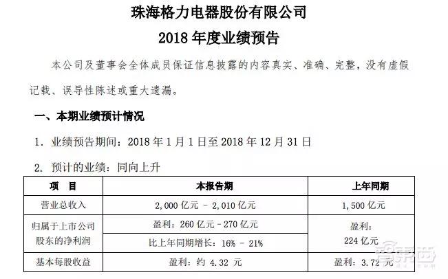 尽管格力还未正式发布2018年的财报,不过此前格力发布的业绩预告显示,2018年全年营业总收入在2000亿元-2010亿元,归属上市公司股东的净利润在260亿元-270亿元。