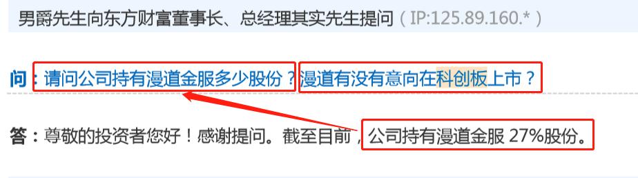 比如,在东方财富2018 年年度报告网上说明会上,一名叫做男爵先生的投资者,向他们董亊长、总经理其实先生提问了两个问题“请问公司持有漫道金服多少股仹?漫道有没有意向在科创板上市?”。