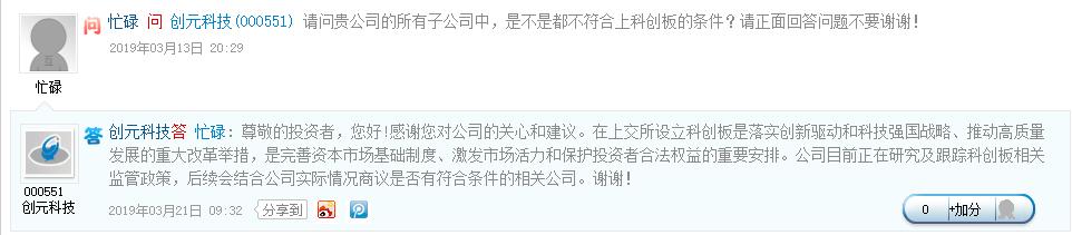 一名叫“忙碌”的网民在询问创元科技科子公司是否符合上科创板条件时,直言“请正面回答问题不要谢谢。”