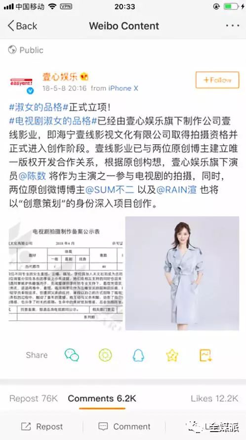 这个脑洞得到了热烈的反响,登上微博热搜,文中提到的演员陈数、曾黎甚至亲自转发。最终,在不到两个月的时间内,《淑女的品格》已正式立项,演员陈数确定出演,成为首部虚拟IP改编的电视剧。