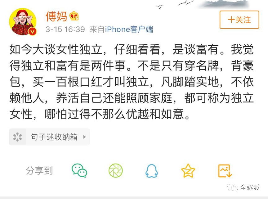 《奇葩说》辩手傅首尔曾经在微博上谈“独立女性”,也许可以给模糊的女性媒介形象一些方向——“不是只有穿名牌,背豪包,买一百根口红才叫独立。凡脚踏实地,不依赖他人,养活自己还能照顾家庭,都可称为独立女性,哪怕过得不那么优越和如意。”