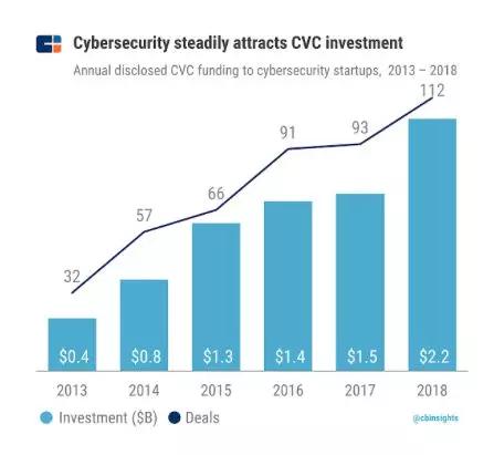 2018年对于网络安全公司来说,也是吸引企业风险投资的标志性一年。2018年总共有112笔交易,比2017年多19笔。但投资金额却增加到22亿美元,高出2017年42%。
