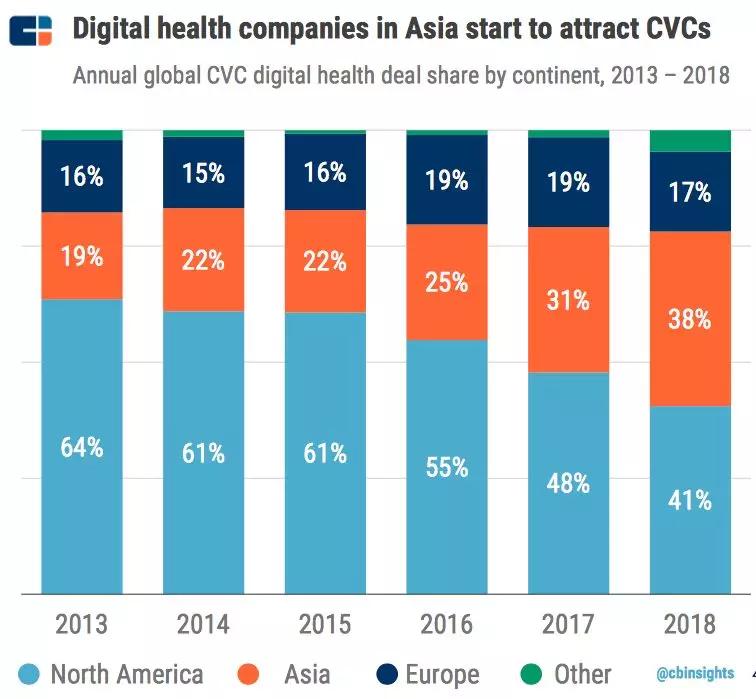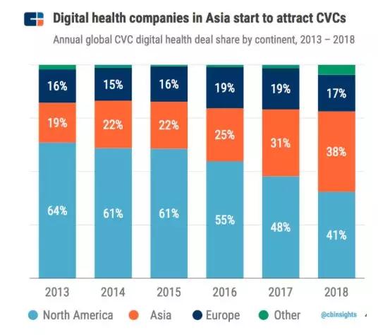 从获投地区来看,2018年亚洲占所有企业风险投资对数字健康公司投资交易数量的38%,比上一年高出7%。相比之下,美国地区占比则下降了7%,为41%。欧洲和其他地区仍然相对停滞不前。