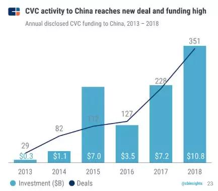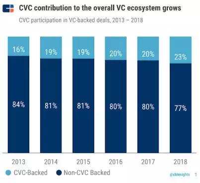 从上图可以看到,2013-2018年企业风险投资在整体风投交易里的占比逐渐增加,2018年,企业风险投资参与了所有风投支持的交易中的23%,比2017年增加了3%。相较2013年,这个份额增长了7%。