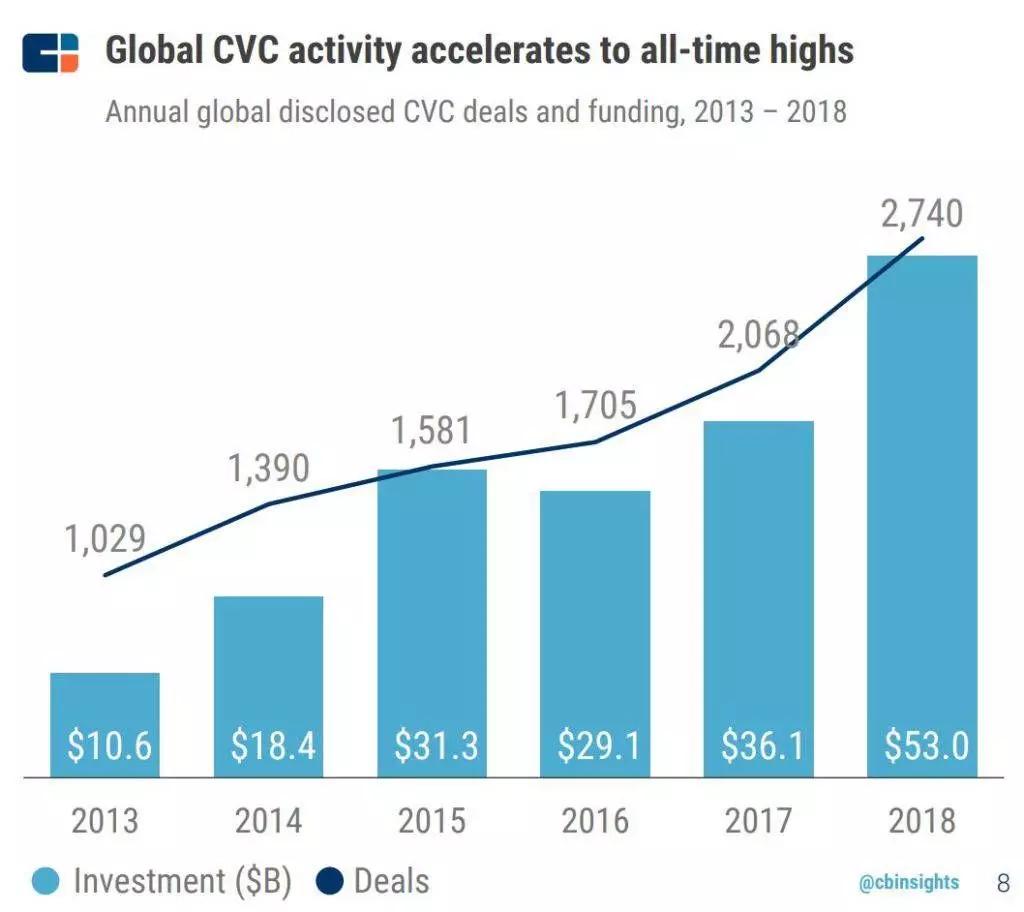 著名风投数据库 CB Insights 近日发布了 2018 企业风险投资报告,据其透露,全球企业风险投资去年共进行了 2740 宗交易,涉及金额高达 529.5 亿美元。