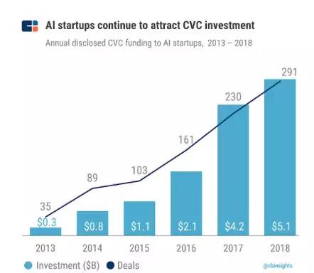 企业风险投资参与的人工智能交易从2017年的230笔增长了27%到2018年的291笔,交易额也从2017年的42亿美元增加了19%到2018年的51亿美元。2018年全球最大一笔人工智能交易是中国面部识别初创公司SenseTime(商汤科技)获得的6.2亿美元融资。