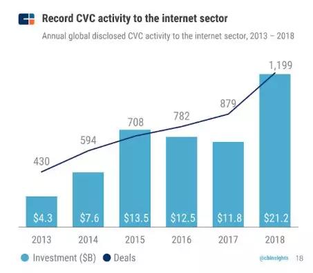 报告发现,互联网初创公司依然抢手,企业风险投资对互联网初创企业投入巨资。据CB Insights数据,这些由企业风险投资公司支持的交易同比增长36%,从2017的879笔交易增长到了2018年的1199笔交易。资金额则在2018年增长了80%,达到212亿美元。