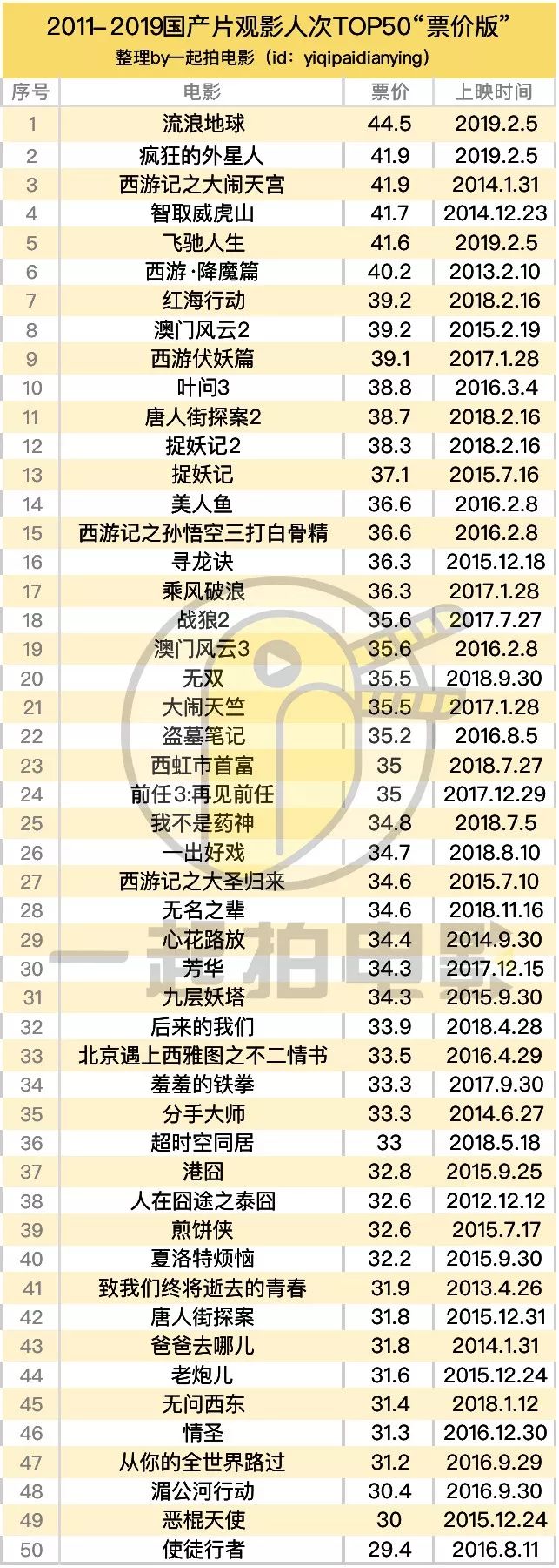 对此,一起拍电影(ID:yiqipaidianying)特意整理了2011-2019年国产片观影人次排行榜TOP50,盘点近九年观影人次的市场情况,分析人次背后与票房的辩证关系、票价变迁,以及我们又该如何提高观影人次问题。