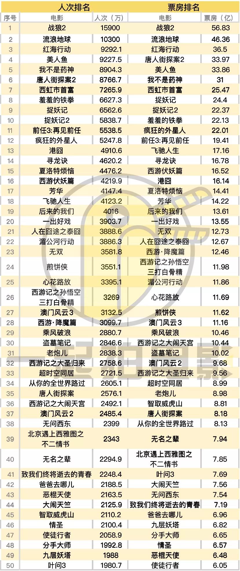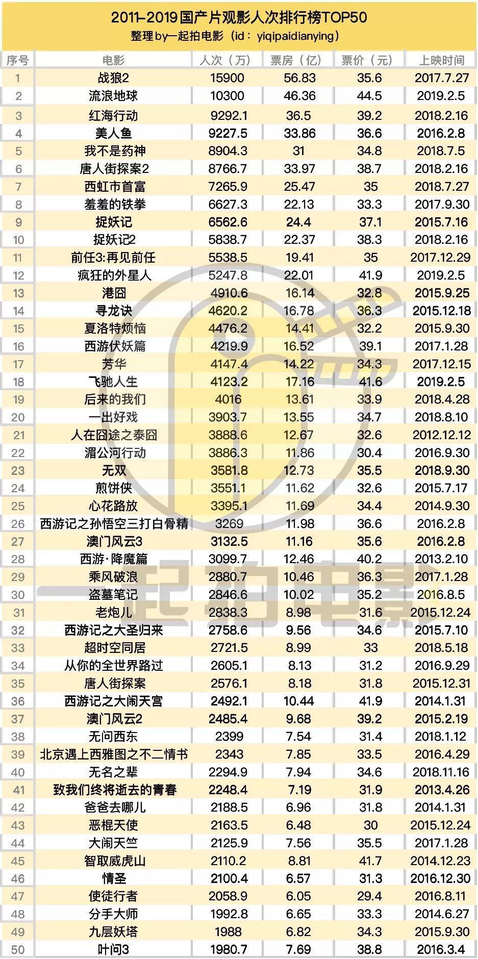 2011-2019国产片观影人次TOP50,谁来拯救我们的观影人次?