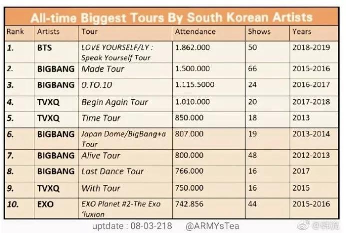 虽然目前韩国偶像已经开始拉开五代团的序幕,但二代团在多项数据上仍然稳坐一线。从巡演场次为例,3月8日最新的记录显示,出道近13年的BIGBANG、出道近14年的东方神起(TVXQ),仍然占据巡演动员人数TOP10的多个位置,其中BIGBANG占据5席,东方神起占据3席。