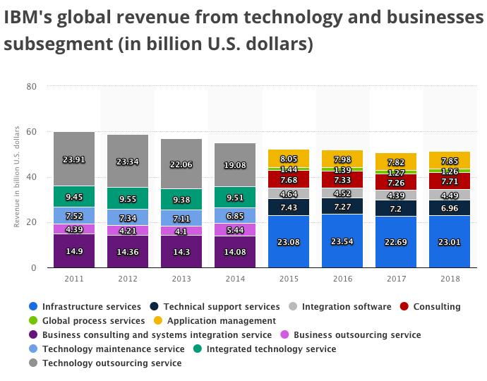 然而,后来发力的 IBM 依然无法追赶上软件出身的微软。更忧伤的是,当它完成上一个时代的转型时,下一个时代已经来临:AWS 在疯狂布局云计算,微软也正将服务全面云化。最直接的后果是,自 2012 年起的 5 年间,IBM 几乎每个季度的收入都在下滑。