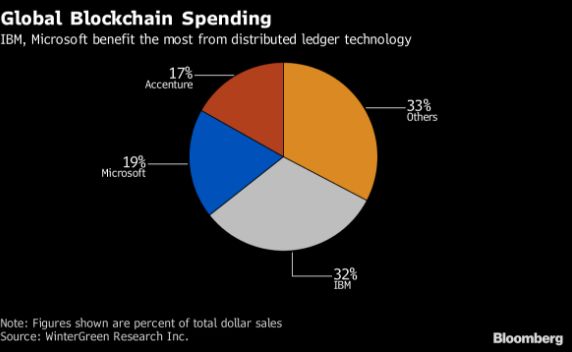 最直观的是,持续下跌的营收在 2018 年实现了营收和利润双双增长的局面。此外,WinterGreen Research 2017 年的报告显示,IBM 和微软瓜分了 51% 的全球区块链市场,其中 IBM 占了32%。
