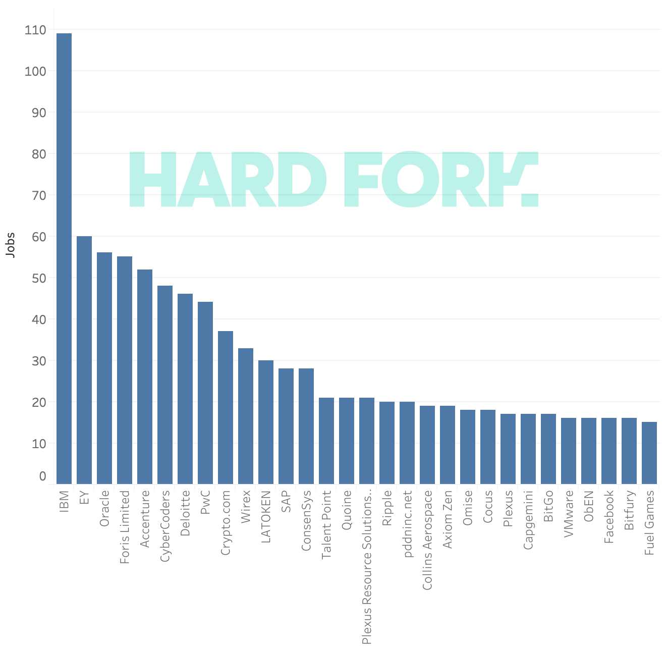 TNW 最新根据 Glass Forkor 搜集发布的统计显示,区块链领域招聘需求最多的是 IBM,有将近 110 个职位,远远超过甲骨文等企业。
