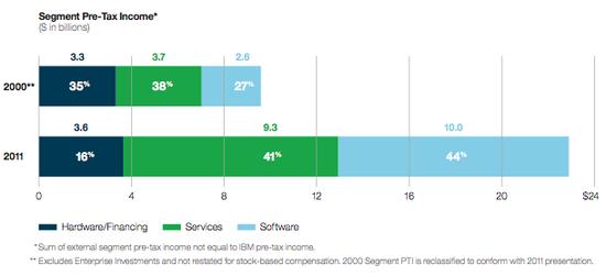 十年间浅蓝色部分的软件业务收益逐渐占领了IBM 营收的大部分